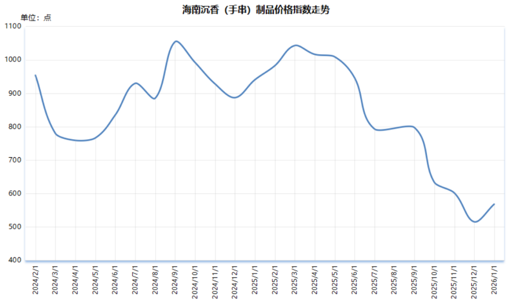 截至2026年1月,海南沉香(手串)制品价格指数报567.45点,较上期上涨52.78点,涨幅10.26%;较基期(2024年1月)下跌432.55点,跌幅43.26%。