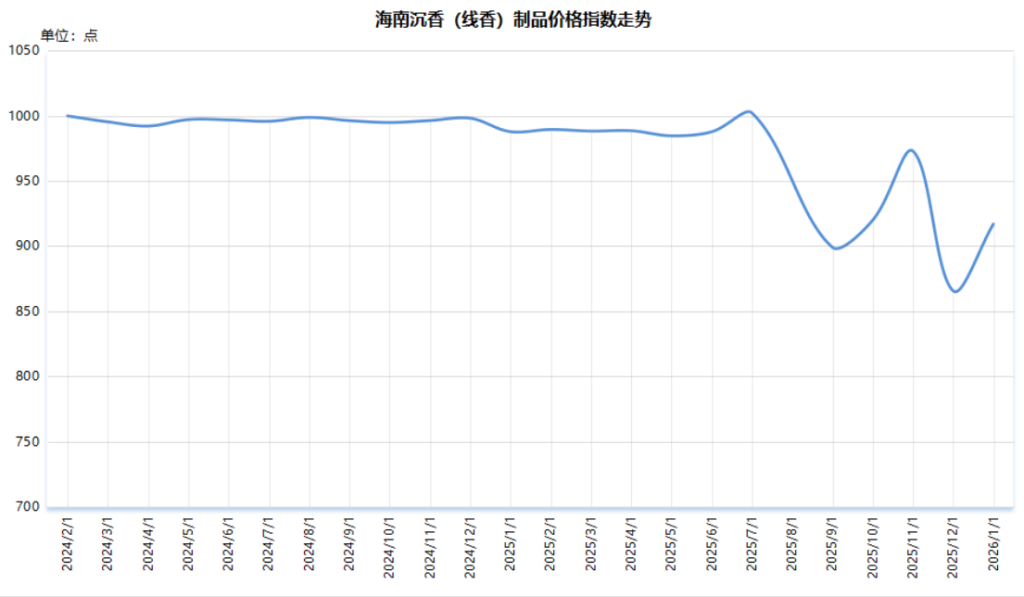 截至2026年1月,海南沉香(线香)制品价格指数报917.03点,较上期上涨51.37点,涨幅5.93%;较基期(2024年1月)下跌82.97点,跌幅8.30%。