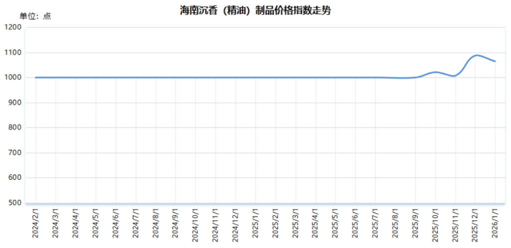 截至2026年1月,海南沉香(精油)制品价格指数报1064.59点,较上期下跌22.83点,跌幅2.10%;较基期(2024年1月)上涨64.59点,涨幅6.46%。