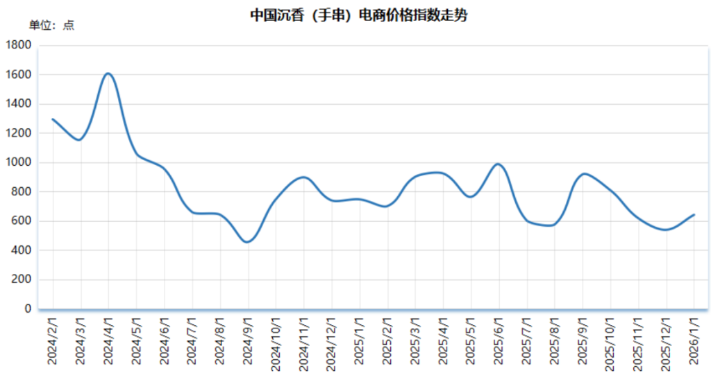 截至2026年1月,中国沉香(手串)电商价格指数报640.63点,较2025年12月上涨102.21点,涨幅18.98%;较基期(2024年1月)下跌359.37点,跌幅35.94%。