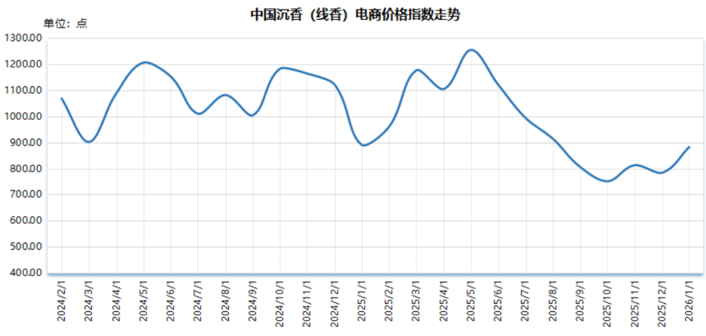 截至2026年1月,中国沉香(线香)电商价格指数报882.66点,较2025年12月上涨99.09点,涨幅12.65%;较基期(2024年1月)下跌117.34点,跌幅11.73%。