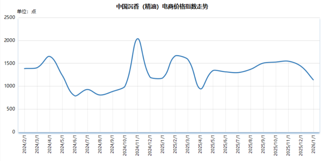 截至2026年1月,中国沉香(精油)电商价格指数报1136.68点,较2025年12月下跌299.71点,跌幅20.87%;较基期(2024年1月)上涨136.68点,涨幅13.67%。