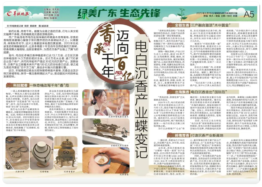从满足国内大健康消费需求,到香飘海外高端市场的崭新征途,茂名沉香产业的升级之路,正是广东省践行“绿水青山就是金山银山”理念,以林业特色产业赋能“百千万工程”的生动注脚。下一步,广东将持续围绕绿美广东生态建设“六大行动”“三大效益”,推动沉香产业发展,实现沉香产品与文化融合、香文化与中药文化融合、康养与旅游融合,促进沉香一二三产业融合发展,切实将广东的生态优势转化为产业优势、经济优势。