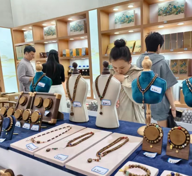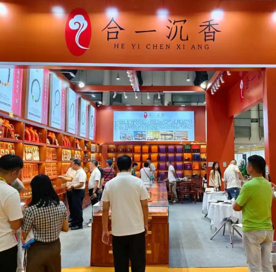 合一沉香”展位陈列的沉香制品涵盖香材、饰品等多品类,吸引大量客商咨询;