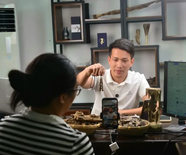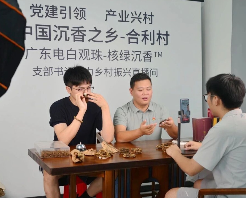 “家人们看过来,这串奇楠沉香手串油脂饱满,香气醇厚,都是咱们村自家林地种的好料加工的!”夜幕下的电白区观珠镇合利村村委会二楼灯火通明,村党支部书记谢培君正与本土网络达人刘济华在直播间里默契配合,屏幕右下角的成交提示声此起彼伏。这场村强村公司主导的直播开播两小时就售出300多件商品,近两个月类似直播已开展20多次。