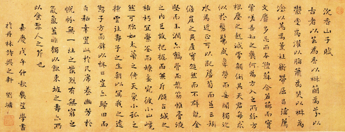 古者以芸为香,以兰为芬,以郁鬯为祼,以脂萧为焚,以椒为涂,以蕙为薰。杜衡带屈,菖蒲荐文。麝多忌而本羶,苏合若芗而实荤。嗟吾知之几何,为六入之所分。方根尘之起灭,常颠倒其天君。每求似于仿佛,或鼻劳而妄闻。独沉水为近正,可以配薝卜而并云。矧儋崖之异产,实超然而不群。既金坚而玉润,亦鹤骨而龙筋。惟膏液之内足,故把握而兼斤。顾占城之枯朽,宜爨釜而燎蚊。宛彼小山,巉然可欣。如太华之倚天,象小孤之插云。往寿子之生朝,以写我之老勤。子方面壁以终日,岂亦归田而自耘。幸置此于几席,养幽芳于帨帉。无一往之发烈,有无穷之氤氲。盖非独以饮东坡之寿,亦所以食黎人之芹也。