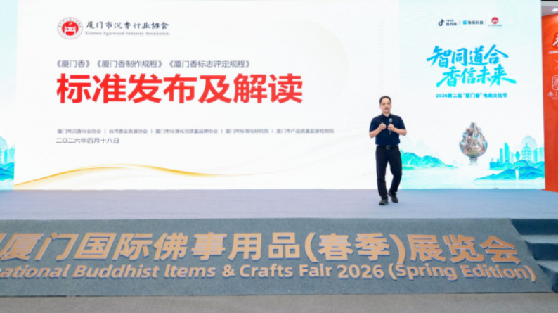 2026 年 4 月 18 日,中国厦门国际佛事用品(春季)展览会上,备受瞩目的首份天然原态香制品三项标准——《厦门香》《厦门香制作规程》《厦门香标志评定规程》,由厦门市沉香行业协会、台湾香业发展协会、厦门市标准化与质量品牌协会、厦门市标准化研究院、厦门市产品质量监督检验院五大机构联合正式发布。这标志着天然原态香制品迈入标准化、规范化的新纪元。厦门香专业委员会主任、非遗传承人、大红康香制品主理人陆广忠先生作为标准的核心起草人之一在会上作专业解读。