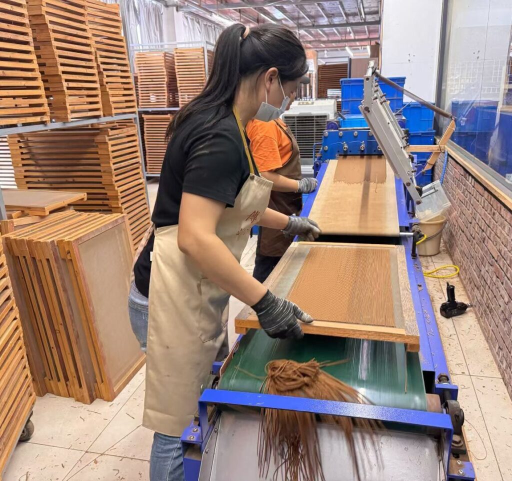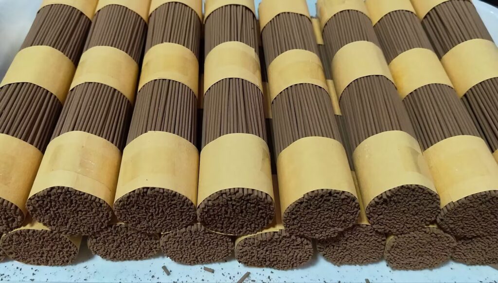线香制作:用挤香器或制香机将香泥挤压成线条 ,并放置在晾香网上。