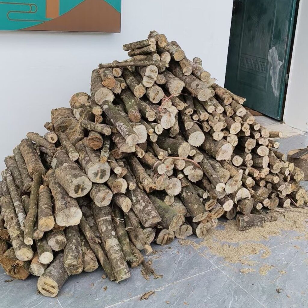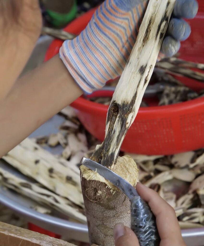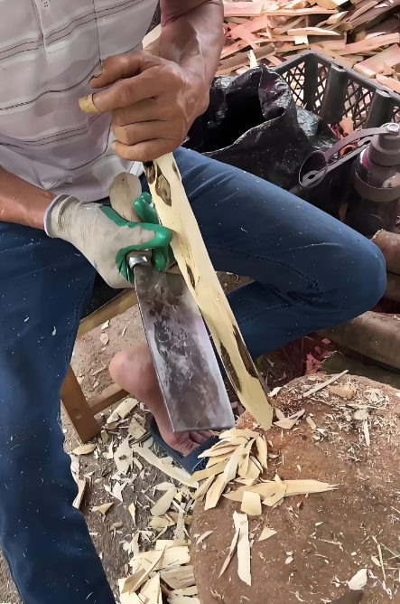 把采回来的树干或树根初步用利刀砍去 、剔除白木部分和腐朽部分后 ,再用具有半圆形刀口的小凿和刻刀雕挖 ,剔除不含香脂的白色轻浮木质和腐烂木, 留下黑色坚硬木质并阴干 ,其碎末则制成沉香末和沉香粉。