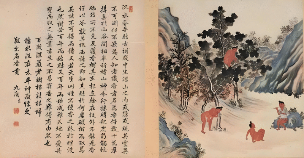 清代《琼黎风俗图·采香图》中记载:“沉水香,孕结古树腹中,生深山之内,或隐或现,其灵异不可测,似不欲为人知者。